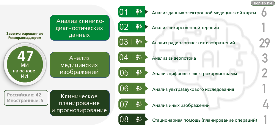 К концу 2020 г. в Российской Федерации началась активная регистрация МИ, использующих технологии ИИ3. Первые цифровые решения, зарегистрированные Федеральной службой по надзору в сфере здравоохранения (Росздравнадзор), обозначили новый этап цифровой трансформации здравоохранения и заложили фундамент для развития единого цифрового контура и внедрения ИИ в здравоохранение.