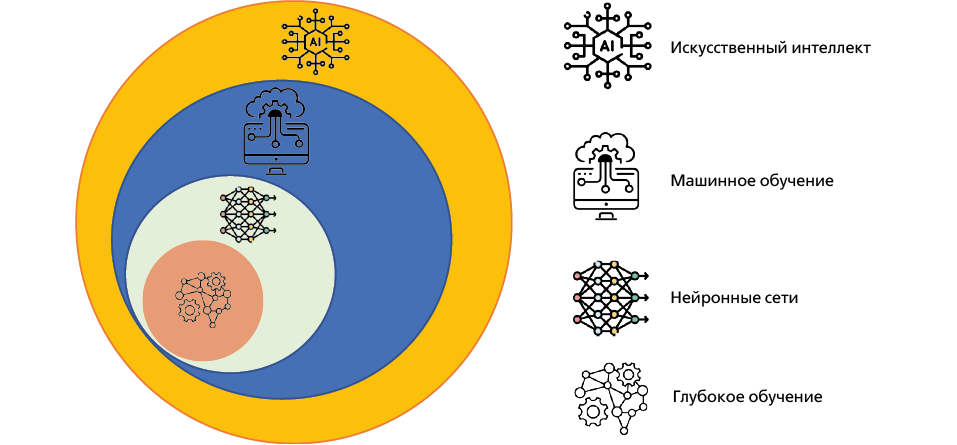 Технологическую эволюцию ИИ можно представить в виде вложенной иерархической структуры, где каждая последующая ступень формируется на основе предыдущей, расширяя ее функциональные возможности и спектр применения. На рисунке 1 показана иерархия ключевых направлений в виде концентрических кругов: внешний круг охватывает всю сферу ИИ, внутренние уровни отражают более специализированные подходы — машинное обучение (Machine Learning), нейронные сети (Neural Networks) и глубокое обучение (Deep learning) [4].